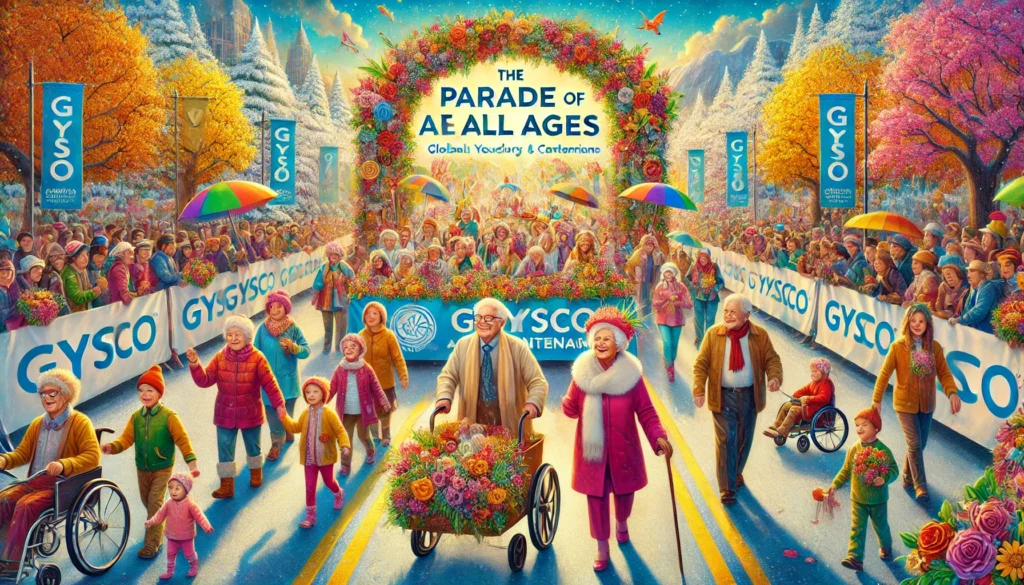An enhanced and vibrant depiction of “The Parade of All Ages,” showcasing a joyful and dynamic procession led by a centenarian, joined by participants of all ages. The image captures the celebration of health, longevity, and unity through colorful seasonal elements and engaging exhibits along the route.