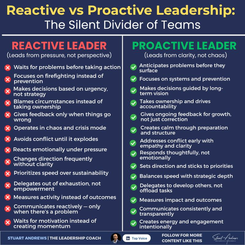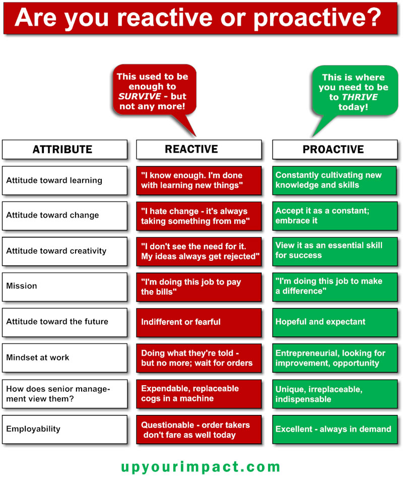 Reactive people respond to short-term inconveniences as they happen, whereas proactive people can wake up each day knowing they’ve done what they can to prepare for any eventuality. 2. Less stress: A proactive approach to life leads to far less stress than is common for more reactive people.