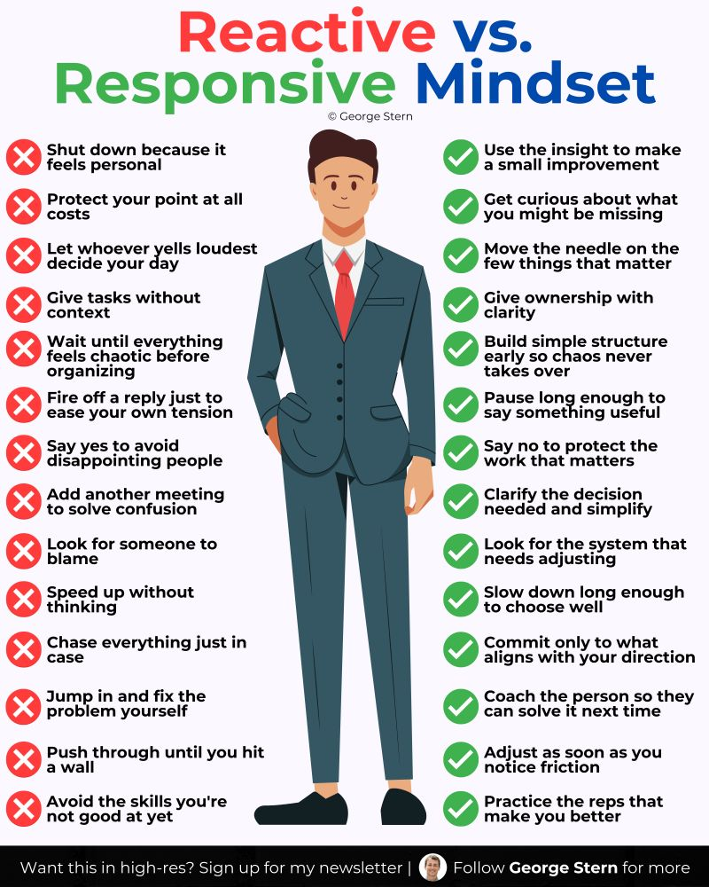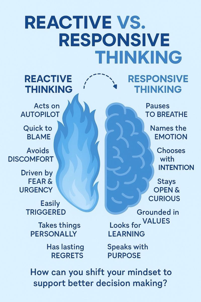 Reactive behavior is immediate, emotional, and impulsive, often driven by survival instincts or past triggers. This type of behavior can lead to defensive actions. In contrast, responsive behavior is deliberate, calm, and thoughtful. It focuses on long-term, constructive, and intentional solutions. Reacting often means losing control to emotions, while responding allows for a pause, helping to maintain control.