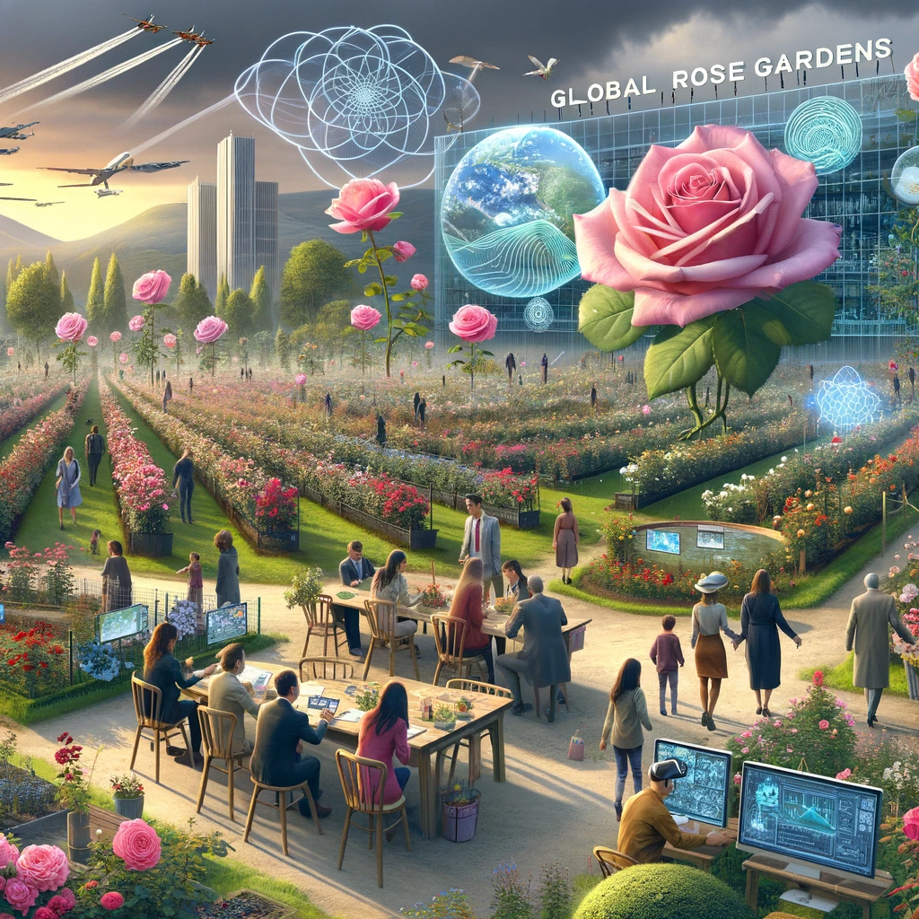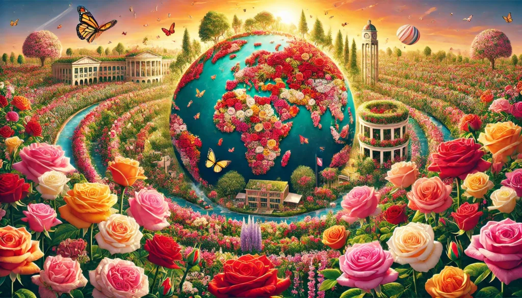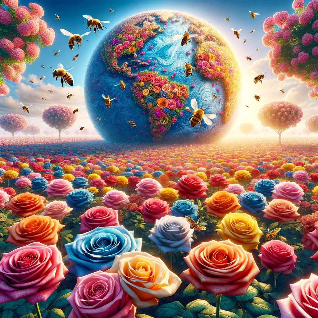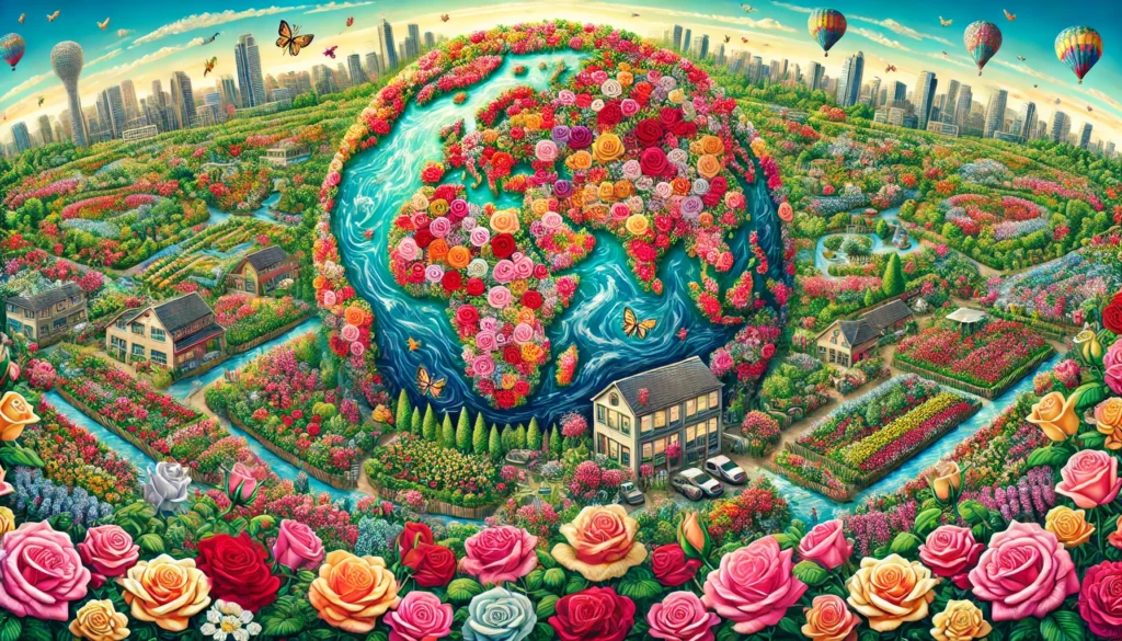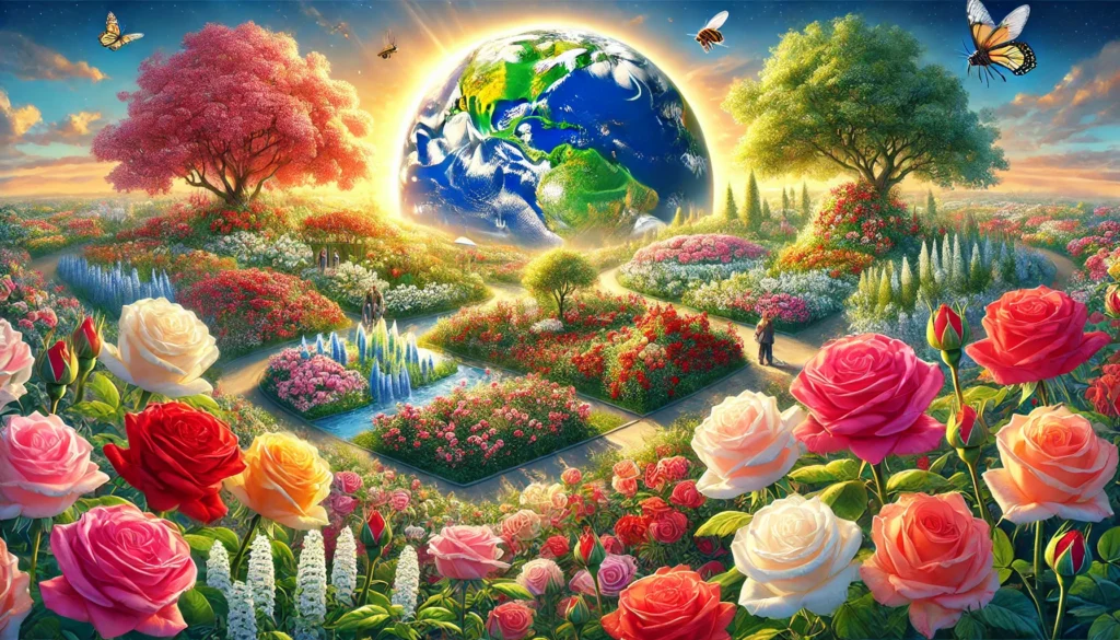 The image capturing the vision of Earth as a global rose garden, filled with vibrant roses blossoming across a range of landscapes, from front yards to beaches. The roses and pollinators create a colorful, soul-enriching atmosphere, highlighting the natural beauty and sweetness that would flourish with such a global rose plantation. Enjoy the scene!