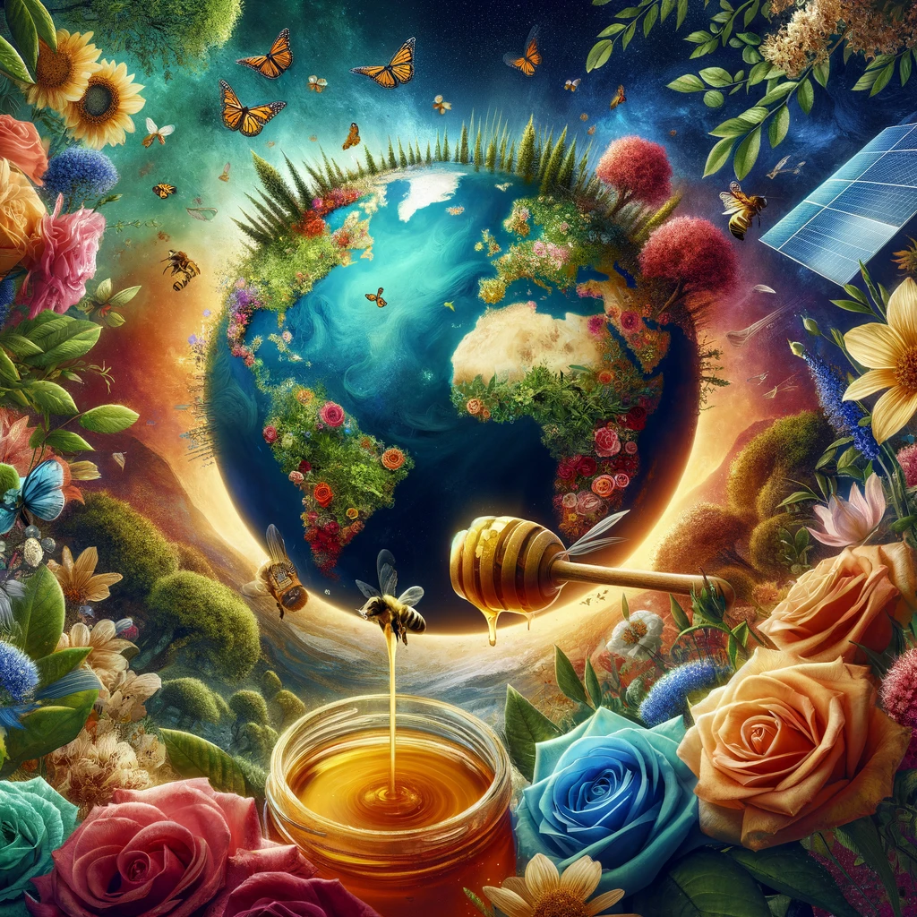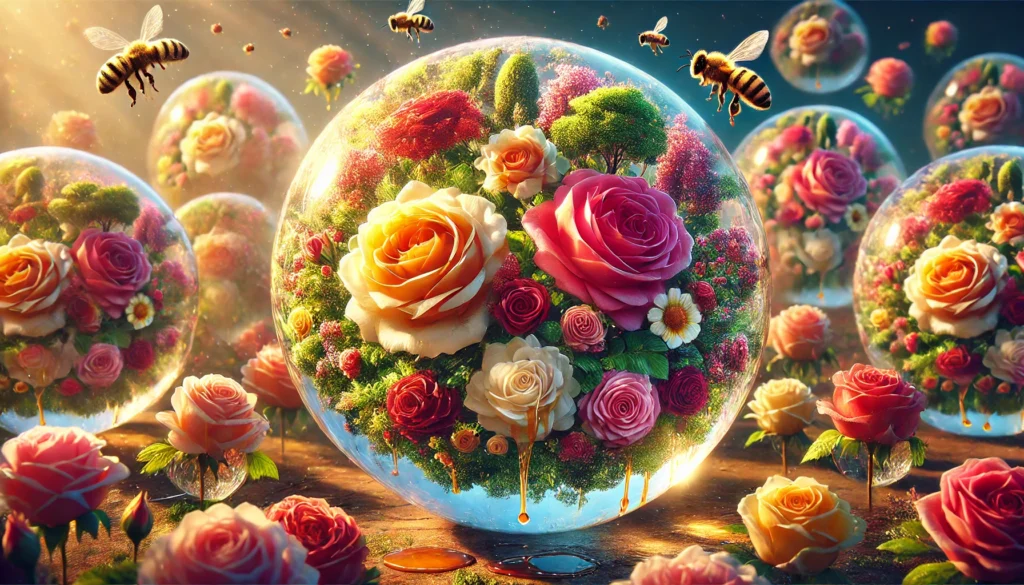 The image features large transparent globes, each filled with colorful, blooming roses. The globes float above Earth, creating a sense of mini rose planets surrounded by warm light, bees, and hints of honey. This dreamy depiction highlights each globe’s beauty, with roses radiating their vibrant colors and sweetness in a serene, enchanting scene. Enjoy the global rose-filled vision!