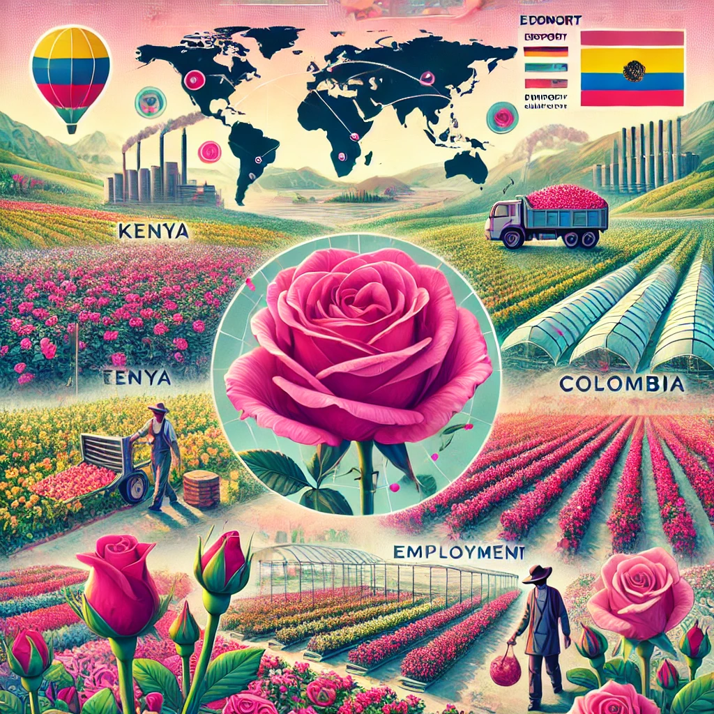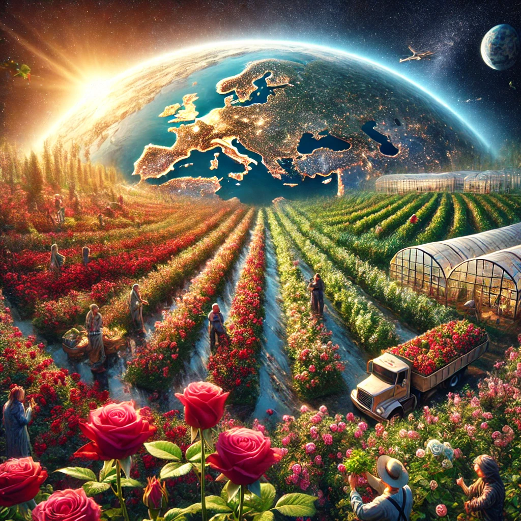 The image illustrates the vibrant and dynamic aspects of global rose production. It visually captures the cultivation, harvesting, economic significance, and global trade elements with a rich, rosy palette.