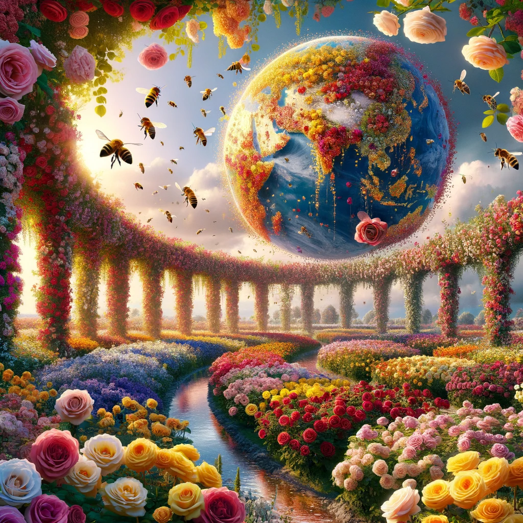 This version showcases the Earth flourishing as a global rose garden, filled with vibrant blooms and lively pollinators. Let me know if you’d like any further adjustments or new variations!