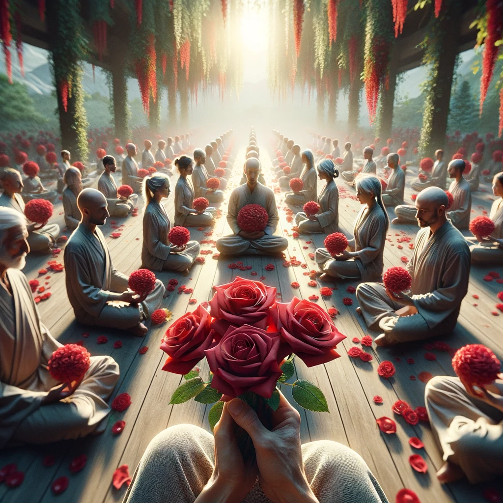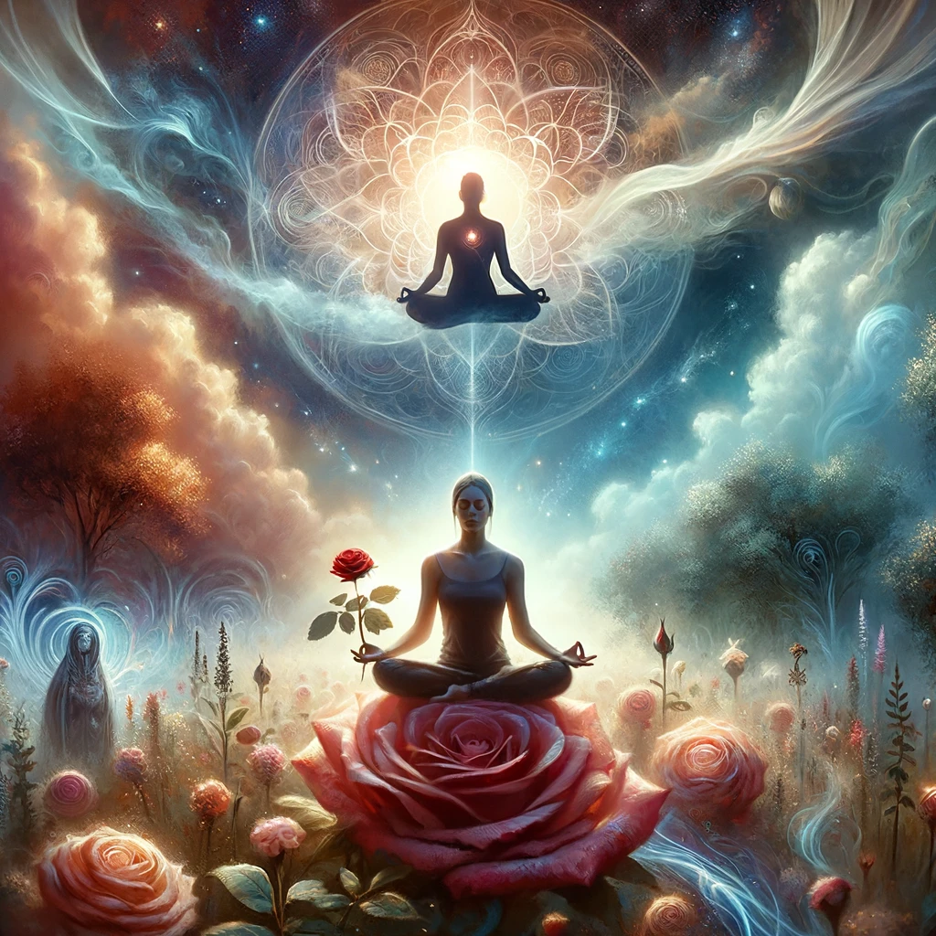 This image represents a serene and transcendent vision of individuals harmonizing with the spiritual and mindfulness benefits of red roses. The polished composition emphasizes divinity, enlightenment, and personal growth, with glowing light and detailed depictions of meditation, prayer, and rose-infused practices.