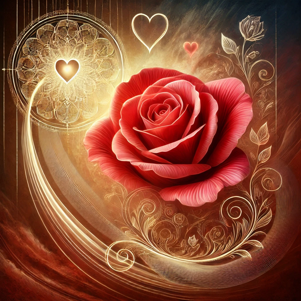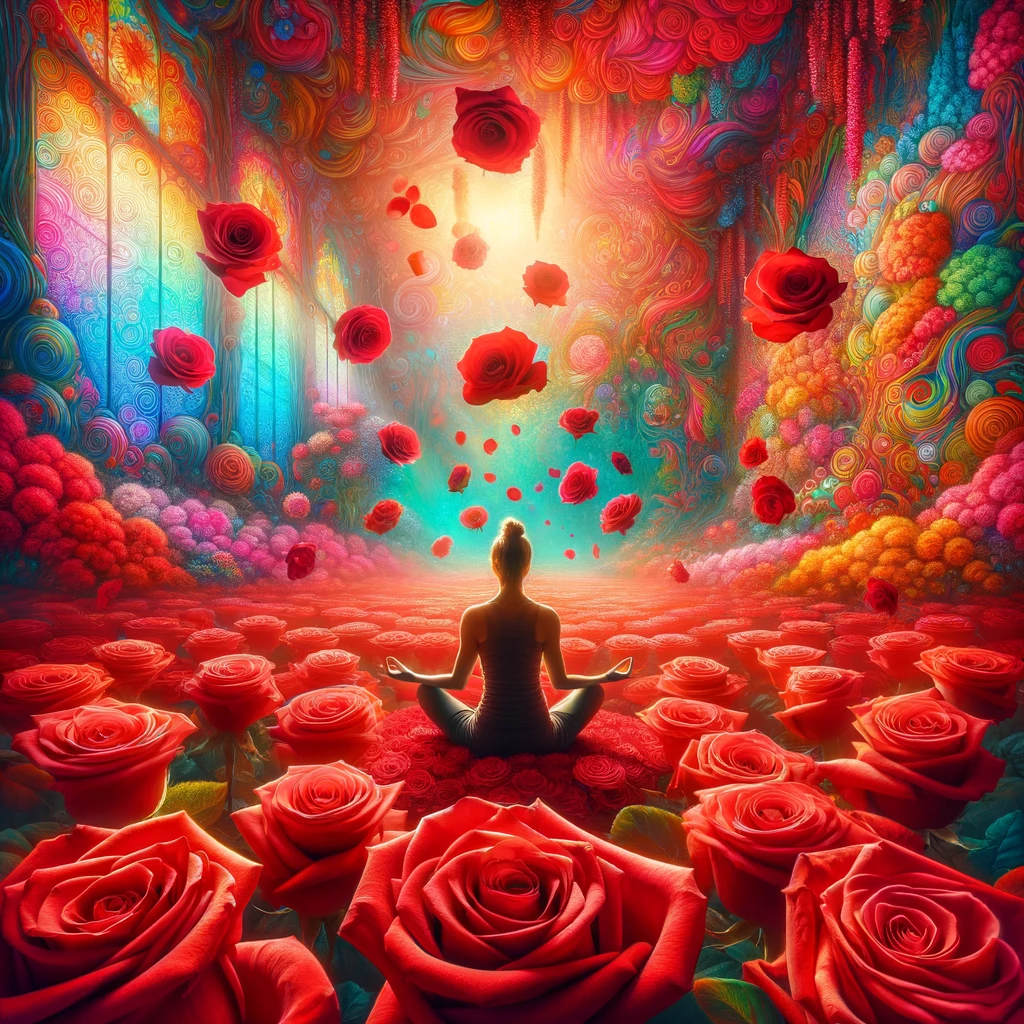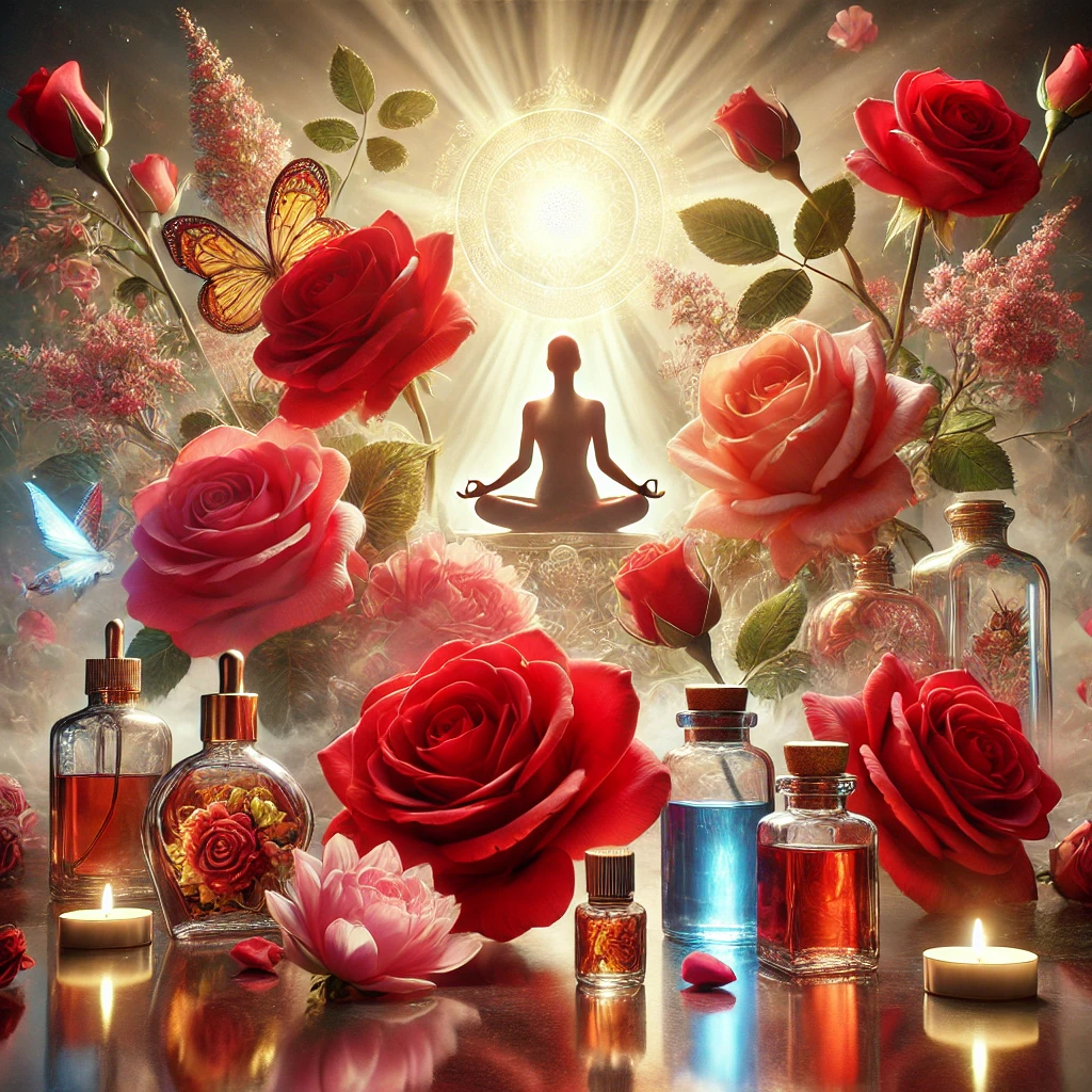 The image illustrates the powerful connection of red roses and their derivatives with spirituality, mindfulness, and personal growth. It highlights their vibrant beauty, natural elegance, and symbolic significance, making the theme vivid and inspiring.