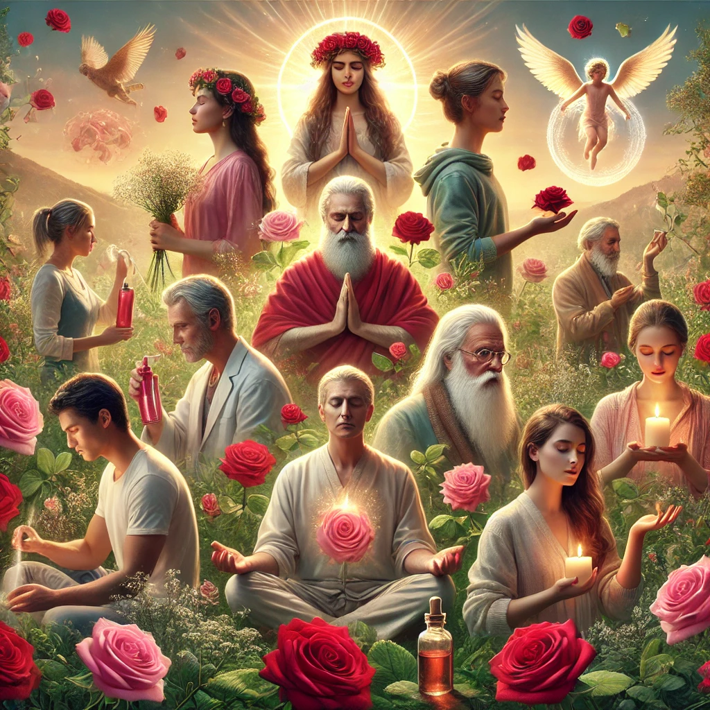 The image shows people engaging with the spiritual benefits of roses in a serene, mindful environment. It captures individuals incorporating rose elements into their practices, such as meditation, prayer, and using rose water and oil, with a tranquil and enlightened atmosphere.