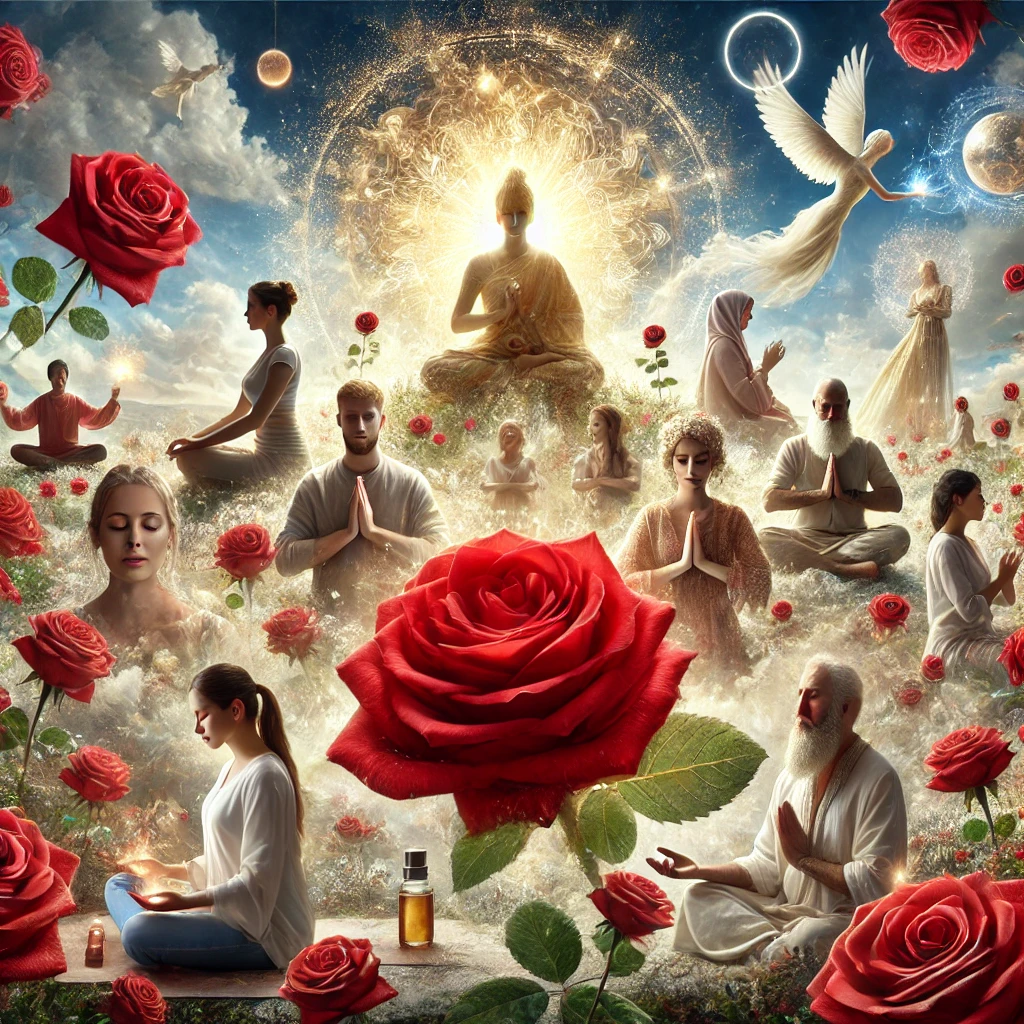 This image represents a serene and transcendent vision of individuals harmonizing with the spiritual and mindfulness benefits of red roses. The polished composition emphasizes divinity, enlightenment, and personal growth, with glowing light and detailed depictions of meditation, prayer, and rose-infused practices.
